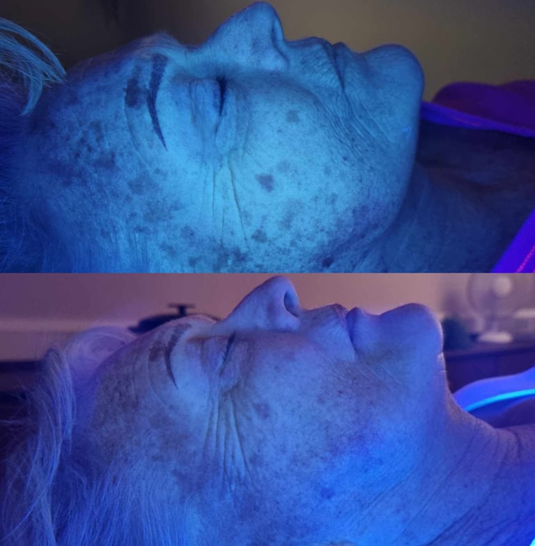 This lady came to me with a range of skin concerns, we determined that her top priority was addressing her pigmentation. Fortunately, she had a good amount of healthy skin, indicated by the blue glow under the lamp (image below), which meant we could start focusing on her pigmentation right away.